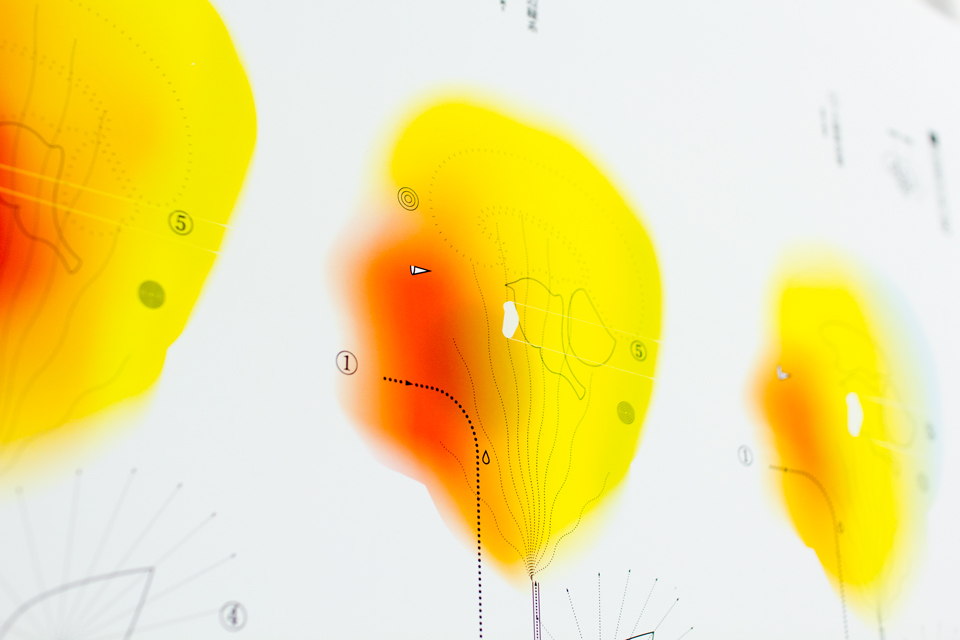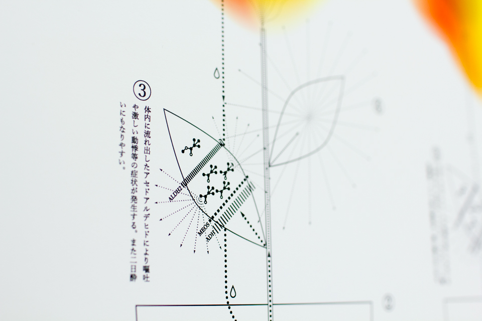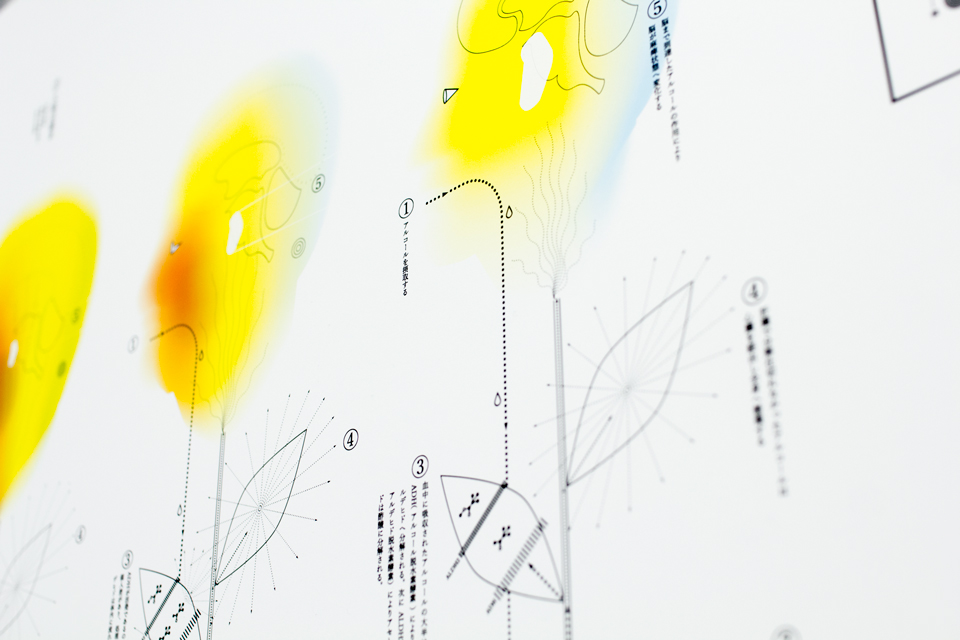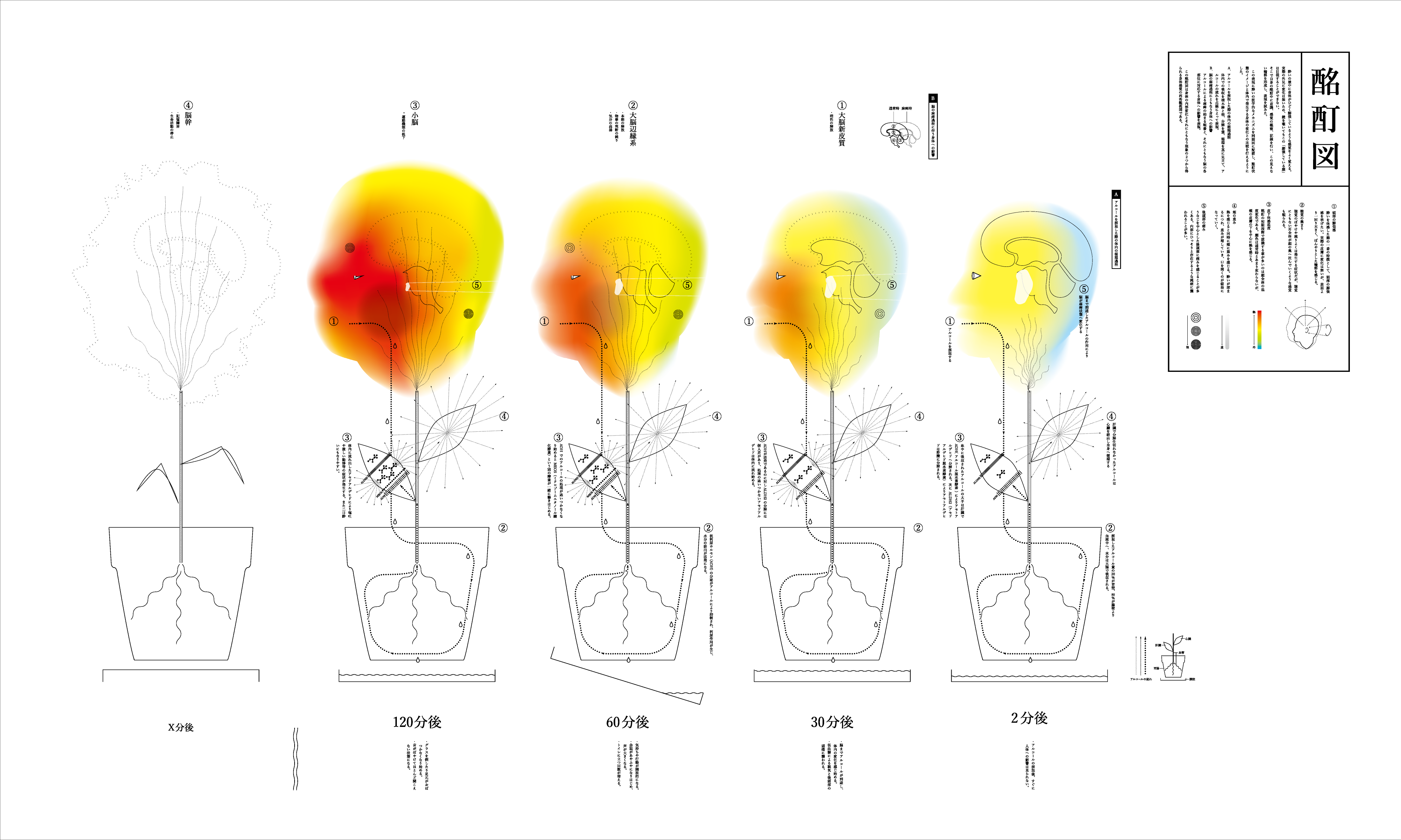 お酒を飲んだ時、顔や手足の輪郭がどこか不安定になる感覚を覚えることはないでしょうか。そんな実体験の記録を元に、酩酊状態の感覚の視覚化を行いました。この酩酊図は身体の内部変化と、それにともなう現象の二つから得られる酔いの身体感覚の再客観視図です。